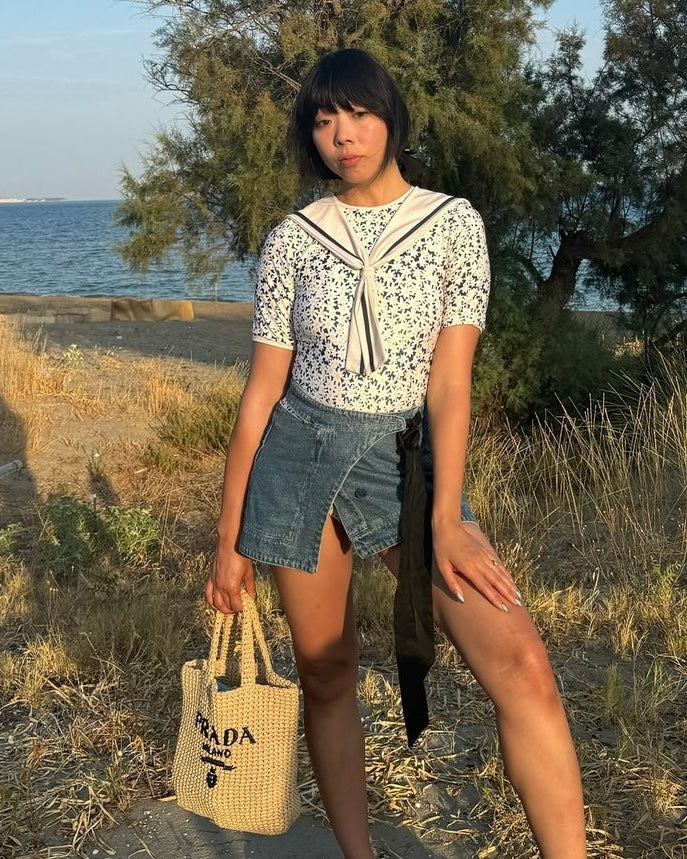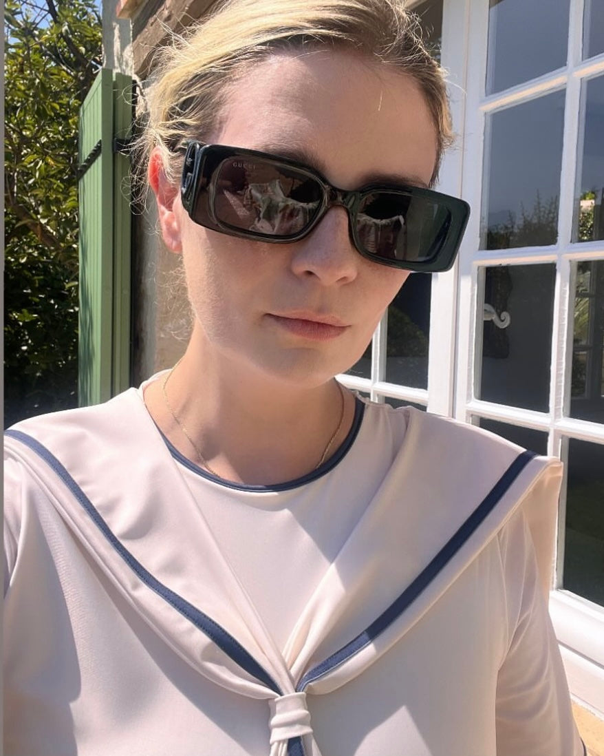 Style: Classic pearl white with navy details and iconic sailor suit elements. Inspired by the haven of elegance, Nice.